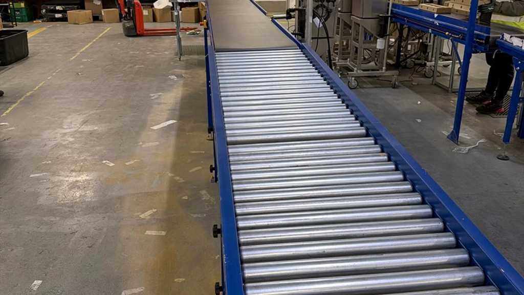 The new system features a 4-metre belt conveyor with a 600 mm-wide belt, designed to smoothly and reliably transport boxed items along the production line. A 3-metre gravity conveyor follows, set at a slight decline, allowing boxes to roll under their own weight after departing the powered section.
